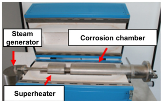 The isothermal oxidation test was carried out at 750 °C in a steam atmosphere under atmospheric pressure for different times: 100, 250, 500, 1000, and 2000 h in the corrosion furnace (Czylok Company, Jastrzębie-Zdrój, Poland) (Figure 1). The furnace was built of a steam generator and tubular reactor divided into two zones: corrosion chamber and steam superheater (Figure 1). A steam generator was installed on the front panel of the furnace with a capacity of 200 mL per hour. During the tests, steam was continuously supplied to the superheater and then to the corrosion chamber. Distilled water with a conductivity of 0.5 µS/cm was used to generate steam. Samples of 10 × 10 × 6.3 mm were cut from the superheater pipe, ground up to 1200-grit roughness, and then cleaned in an ultrasonic cleaner for 5 min in acetone. Due to the difficulties arising from the possibility of preparing the sample surface for the oxidation test, only the outer surface and the side walls of the samples were ground. The kinetic of oxidation was determined by mass gain. The mass gains for each temperature were measured using an electro balance (±0.1 mg accuracy) after the specimens fully cooled to room temperature.