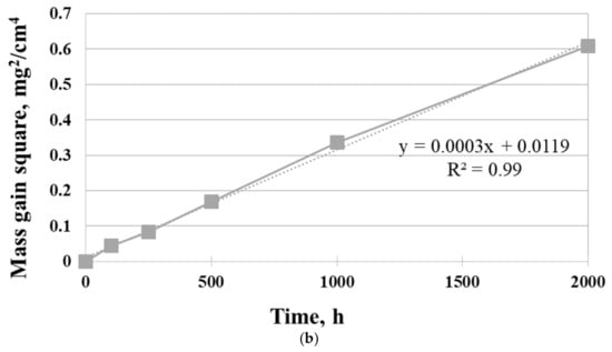 As can be seen, the mass gain of superalloy was in accord with the parabolic law. Additionally, the mass loss of samples was not observed. Fitting the curve of oxidation kinetic according to the Formula (1):