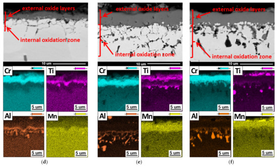 Literature data [22,23] suggest that TiO2 oxides form at the beginning of oxidation (before Cr2O3 oxide). However, the higher Cr content in the chemical composition of the superalloy caused significant growth and dominance of Cr2O3 oxide on the superalloy surface. In addition, the presence of α-Al2O3 oxides, which are internal oxidation products, was identified only on the border with the substrate (Figure 5 and Figure 6). The absence of α-Al2O3 oxides in the oxide layer and the steam-oxide layer interface resulted from the high partial pressure of oxygen (pO2) in these areas, which prevented its formation [9]. Based on the obtained results, it was found that the oxide layer after 100 h of oxidation was formed as a result of the diffusion of Cr and Ti.