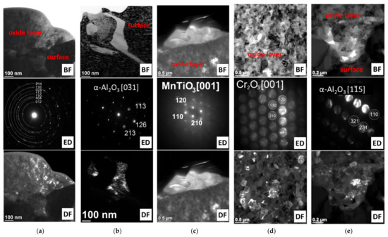 Lengthening the oxidation time caused a growth of the external oxide layer and depletion of the alloy’s surface layer, which was mainly controlled by the controlled diffusion of Ti and Cr from the matrix (Figure 5). The investigations of the superalloy surface after 1000 h showed that the outer part of the external oxide layer was TiO2 oxide crystallites, which grew with time (Figure 5d,e). The formation of TiO2 at the steam-oxide layer border resulted from the easy diffusion of Ti ions through the Cr2O3 layer [22,23]. Moreover, evaluation of the chemical analysis of the external oxide layer also revealed diffusion of Mn, whose beginning started earlier, i.e., after 1000 h of oxidation (Figure 5). Increased concentration of Mn was observed in the areas where TiO2 was present. The authors of the papers [22,23,24,25] about the evaluation of the oxidation resistance of Inconel 740 and 740H superalloys described the presence of Mn in the chemical composition of the formed oxide layers. It was noted that the depletion of the surface layer of the alloy in Ti and Cr may cause diffusion along the layer of other components, e.g., Mn [14,16]. Moreover, the Mn ions can also diffuse through the Cr2O3 layer. Subsequent identification of the phase composition (SAED) of the external oxide layer after 2000 h of superalloy oxidation revealed that Mn reacted with TiO2 oxide and formed the MnTiO3 complex oxide, which was characterized by an irregular shape of crystallites (Figure 6c).