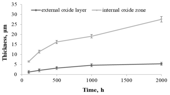 Examination of the thickness of the external oxide layer and the internal oxidation zone revealed that the internal oxidation process was faster than the formation of the oxide layer on the superalloy surface, which proved the strong tendency of this alloy to form internal oxides (Figure 9).