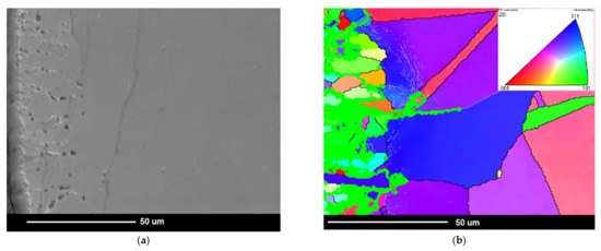 Apart from the presence of the internal oxidation zone, discontinuities (voids) also appeared at the grain boundaries of superalloy. Based on the SEM observations, it was found that the discontinuities appeared after 500 h of oxidation and their amount increased during oxidation (Figure 5 and Figure 7). The paper [24] showed that the discontinuities could have arisen as a result of the Kirkendall effect. The Kirkendall effect consists in the non-equilibrium diffusion of Ti, Cr, Mn, and Al, which diffuse into the oxide layer on the superalloy surface. Apparently, the diffusion of oxygen into the material could also contribute to the formation of grain boundary discontinuities. However, it should be emphasized that the presence of internal oxides improves the corrosion resistance of superalloys. The formation of internal oxides in the alloy matrix improves the adhesion of the oxide layer to the alloy surface by the increase in mechanical bonding. Consequently, the oxide layer shows greater resistance to thermal and mechanical shocks [27]. Moreover, the microstructure of the superalloy below the oxide layer may reduce fatigue resistance, fracture toughness, and tensile strength of the alloy. It is caused not only by the presence of hard oxide particles and the disappearance of the γ′ phase in the internal oxidation zone, but mainly as a result of the internal stresses’ formation in the matrix due to the growth of the internal oxide [30]. This was confirmed by studies on grain orientation of alloy after 2000 h of oxidation in steam by electron backscatter diffraction (EBDS-IPF map) (Figure 10).