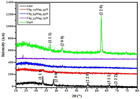 Over the last two decades, the electronic industry has progressed drastically and, for materials scientists, has reached new horizons in the field of optoelectronics. The group II-VI elements have special importance for optoelectronics and chalcogenide semiconductors of this group such as Cd, Mg and Zn; their ternary alloys; and their oxides [1,2,3,4] are studied widely due to their excessive use in solar cells, photodetectors, photodiodes, gas sensors, transparent electrodes, and photo transistors [5,6,7,8,9,10], etc. There are few reports which regard CdO and MgO as a CdMgO ternary alloy. The compound CdO is a conducting material with a direct band gap of ~2.5 eV [11]. It shows transparent behavior in the visible region of electromagnetic spectrum. It has a cubic structure similar to rock salt, randomly oriented along the (111) plane and has a lattice constant of 4.70 Å. The compound CdO is a highly electrically conductive material owing to its increased concentration (~1021 cm−3) of free charge carriers. On the other hand, MgO has a rock-salt-like structure with a high band gap of 7.8 eV [12]. Its lattice constant is a = 4.24 Å, which is 1.11 times less than CdO. The compound MgO is a chemically and thermally stable oxide with a variety of applications in material science and technology. It also acts as a buffer layer for several materials such as metals, semiconductors and in many optoelectronics devices. However, CdO is not an efficient material for photovoltaics and optoelectronics due to its low optical band gap. It is reported that there are several dopants including indium, fluorine, lead, zinc, copper and gadolinium to improve the optical band gap of CdO [13,14,15,16,17,18]. Hence, by using MgO, which has a direct band gap of 7.8 eV with CdO, the optical band gap and UV luminescence may be modulated. The ions of Cd++ can be replaced with Mg++ ions to improve the electrical and optical characteristics of CdMgO. Consequently, the ternary combination CdMgO, which has a wide tunable band gap range of 2.5 to 7.8 eV, can be considered as a suitable compound for a buffer layer in solar cells and other optoelectronic devices. Despite their ability to tune the energy band gap, CdMgO films have received little attention. Only a few studies on the structural, morphological, electrical, and optical aspects of CdMgO thin films have been reported.