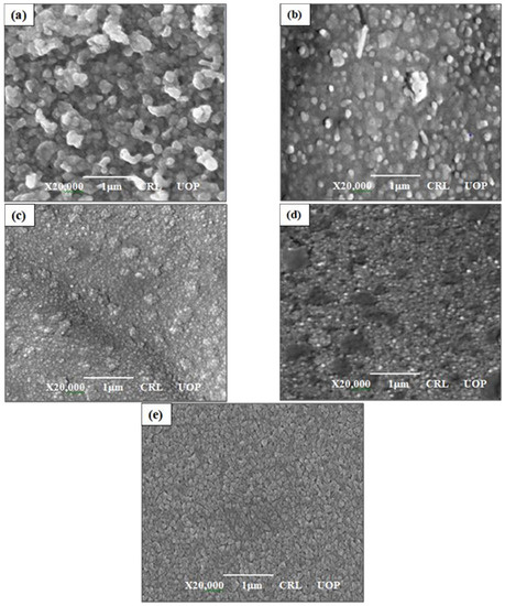 Figure 3 shows the surface morphology of the annealed thin films. Figure 3a shows the surface morphology of CdO (undoped) films with interconnected spherical grains and some spaces. Figure 3b–e displays the influence of Mg concentration deposited on the CdO films; the grains started to modify into small nanocrystals/nanostructures throughout the whole surface of CdMgO. With the further increase of Mg content, images revealed that films became denser and more compact, which is required in photovoltaic applications to increase their efficiency.