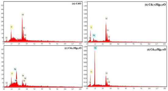 EDX spectra of (a) CdO; (b)Cd0.75Mg0.25O; (c) Cd0.5Mg0.5O; (d) Cd0.25Mg0.75O.