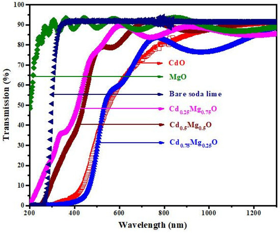 Transmittance spectra of CdO; Cd0.75Mg0.25O; Cd0.5Mg0.5O; Cd0.25Mg0.75O; and MgO annealed thin films.