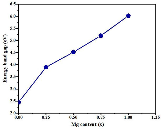 The energy band gap of CdMgO increased from 2.45 to 6.02 eV when the Mg concentration increased, as seen in Figure 7a–e.