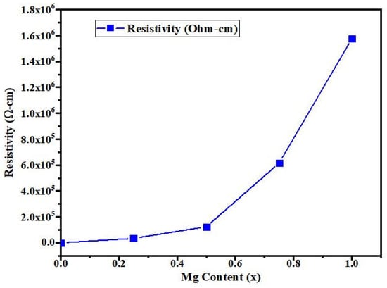 Figure 9 shows the electrical resistivity of CdMgO thin films with increasing Mg content; the electrical resistivity of CdMgO proportionally to Mg content, from 535 Ω cm for pure CdO to 1.57 × 106 Ω cm for CdMgO. This rise in resistivity was due to the increase in the band gap energies which occurred with the increase in Mg content in the films. The other factors for the increase in resistivity were due to the presence of oxygen vacancies, the reduction in the Cd interstitial site in the films and the increase in grain boundaries.