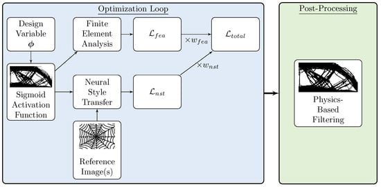 This section describes the weighted objective approach for topology optimization developed for this work. Each objective and constraint, including the structural objective and neural style transfer loss, are summed to develop a single loss function to be optimized. Figure 1 illustrates how each iteration of the analysis runs, starting with the design variable, , and concluding with the total loss sent to the optimizer. The unconstrained design variable is converted with the sigmoid function to be between 0 and 1. The result is used to calculate the loss, , for the given design problem with the objective function value from finite element analysis and comparing the geometric style with the reference image(s) using neural style transfer through mean squared error (MSE). Both results are multiplied by a weight, w, and summed to form the total loss used in the optimizer. After the optimization is complete, the result is post-processed using a physics-based filter to remove extraneous artifacts left from the optimization and smooth the result for manufacturing.