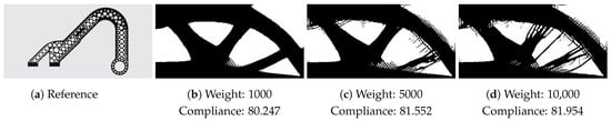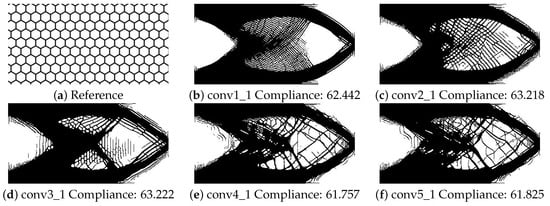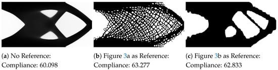 Figure 5a shows the optimized design for the MBB design problem without any reference input. The optimized design is characterized by three large supporting members inside the design envelope to support the force.
