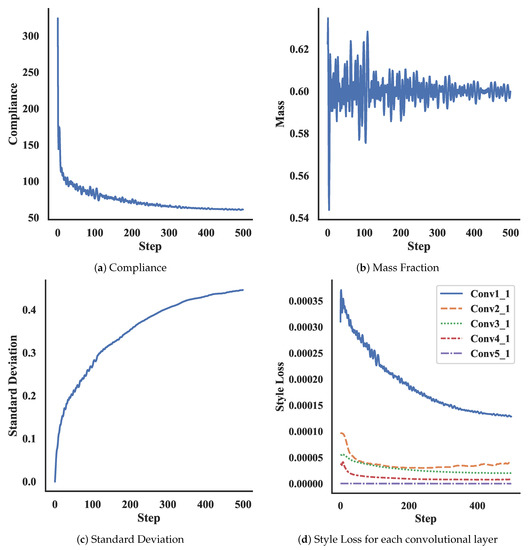 Figure 9 shows the convergence history for the result shown in Figure 7c for each function: compliance, mass fraction, standard deviation, and style loss for each layer. All presented results follow similar histories. At the start of training, the optimizer greatly improves the compliance value and style losses and exceeds the desired volume fraction. After some steps, more material is removed and the volume fraction correspondingly decreases until it falls below the desired volume fraction, with improving compliance and style loss values. Towards the later stages, the improvements to the compliance and style loss diminish. For each oscillation of the volume fraction, the compliance and style loss values correspondingly oscillate. The values continue to improve at a much slower rate until the given number of steps is reached. Although the losses have not converged after the training procedures, the overall structure changed minimally at the end of the optimization, only varying in particular regions. These regions were processed using the physics-based filter to complete the optimization. With different parameters from Table 1, more or less iterations may be required to achieve a final design.