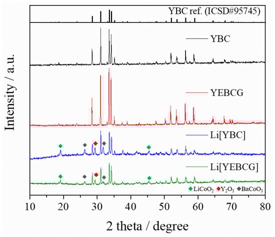 To prepare YBC and YEBCG powders, stoichiometric Ba(NO3)2 (99.95%, metal basis Alfa Aesar), Er(NO3)3·5H2O (99.9%, Alfa Aesar), Y(NO3)3·6H2O (99.9%, Alfa Aesar), (NH4)2Ce(NO3)6 (99.99%, Alfa Aesar), and Ga(NO3)3·xH2O (99.9%, metal basis, Alfa Aesar) were dissolved in distilled water with glycine as a combusting fuel and then heated on a heating plate (MSH-20D, DAIHAN Scientific Co., Ltd., Wonju, Korea) at 350 °C until the metal nitrates converted into black ashes. After the combustion, the ashes were ground with a mortar and then calcined at 1000 °C for 12 h under an air atmosphere to obtain a single-phased crystalline [22]. In order to identify the crystal structure of the YBC-based materials, an X-ray diffraction (XRD) technique (X’Pert, PANalytical, Cu Kα radiation, Almelo, The Netherlands) was carried out with a step size of 0.026° in a 2θ range from 10 to 80°. Utilizing the XRD data, the FullProf software was used for Rietveld refinement to yield lattice parameters. The morphological characterization of the YBC-based materials was performed using a field emission scanning electron microscope (FE-SEM, SU-8010, Hitachi Ltd., Tokyo, Japan) with energy-dispersive X-ray spectroscopy (EDS). To measure the Brunauer-Emmett-Teller (BET) surface area, nitrogen gas was used for an adsorption/desorption method (BELSORP-max, BEL Inc., Leitchfield, KY, USA) at 77 K to remove residual impurities and moisture with an average mass of 0.54 g for each specimen. For the sake of Li-intercalation, the synthesized YBC and YEBCG were mixed with LiOH‧H2O in a molar ratio of 1:1.1, followed by calcination under air atmosphere for 10 h at 800 °C. The Li-intercalated YBC and YEBCG oxides are referred to as Li[YBC] and Li[YEBCG], respectively.