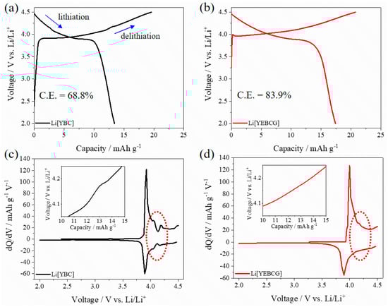 (a,b) Initial charge/discharge and (c,d) differential capacity curves of Li[YBC] and Li[YEBCG], respectively. A distinct phase transition region (red-dotted circles in (c,d)) in the potential around 4.2 V was displayed with insets of the corresponding voltage profile. (C.E.: Coulombic efficiency).