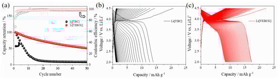 Figure 5 presents the cycle performance of the cathode active materials for 50 cycles at 0.1 C in a potential range of 2.0–4.5 V. The capacity retention of Li[YBC] was drastically aggravated right after the initial cycle and reached less than 10% after about 20 cycles. By contrast, Li[YEBCG] showed superior capacity retention with a relatively stable feature of Coulombic efficiency over the entire cycling process. After 50 cycles, Li[YEBCG] had a capacity retention of 50%, which was about ten times higher than Li[YBC]. The corresponding voltage profiles of Li[YBC] (see Figure 5b) clearly showed rapid capacity fading with increasing overpotentials during cycling, while Li[YEBCG] presented a feature of mitigated capacity fading (see Figure 5c), indicating the positive effects of co-doping with Er and Ga on the suppression of the undesired phase transition as aforementioned in Figure 4. Long-term cycle performance was additionally conducted in the potential range of 2.5–4.3 V in Figure S1, which is closer to the practical operating condition of LIBs including a constant voltage charging step with a moderate charging cut-off potential. The long-term cycle performance showed relatively enhanced cycling stability compared to the 4.5 V cut-off condition resulting from a limited (de)lithiation range, which led to decreased discharge capacities for both samples. In general, a higher upper cut-off potential shows higher capacities at the expense of cycling stability [28].