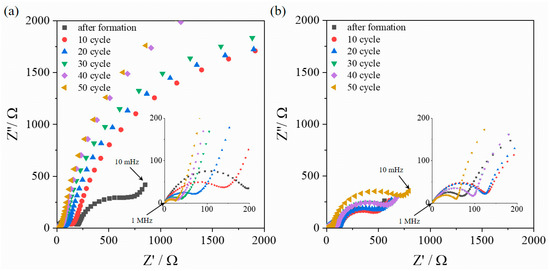 Nyquist plots of (a) Li[YBC] and (b) Li[YEBCG] with increasing cycle numbers.