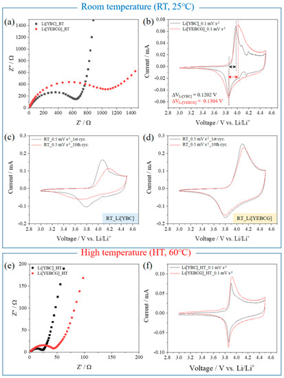 Nyquist plots and CV curves of Li[YBC] and Li[YEBCG] under various experimental conditions. (a,e) EIS data before the CV tests at equilibrium states, (b,f) initial CV curves at 0.1 mV s−1, and (c,d) CV curves during the 1st and 10th cycles at 0.5 mV s−1, where (a–d) were tested at 25 °C and (e,f) at 60 °C.