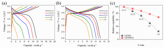 Rate capability of (a) Li[YBC] and (b) Li[YEBCG], and (c) their relative capability at various discharging C-rates from 0.1 to 2 C with a fixed charging C-rate of 0.1 C.