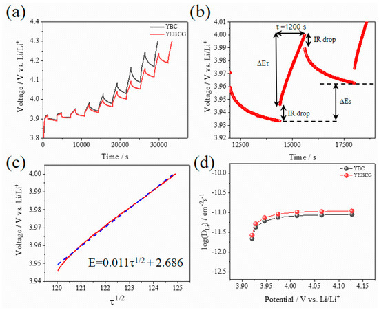 (a) GITT curves of Li[YBC] and Li[YEBCG] during the second charge process at a current density of 4.6 mA g−1. (b) GITT curve at a single titration step of Li[YEBCG] with (c) corresponding linear behavior in the relationship of E vs. τ1/2. (d) Li-ion diffusion coefficients of Li[YBC] and Li[YEBCG] calculated from the GITT curves as a function of the cell potential.