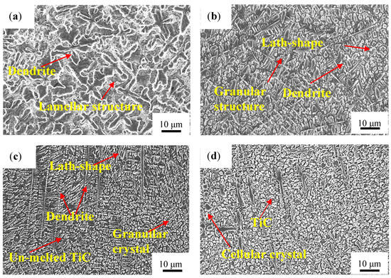 Figure 5 shows the typical microstructures of the four coatings, respectively, at the middle zone of the coatings. It is worth noting that there is a significant difference in the cross-sectional microstructure of the coating along the depth direction. As can be seen from Figure 5a, dendrites and surrounded lamellar crystals are generated in the Ti-Al-Si laser cladding layer because of the high supercooling. Therefore, the crystals of the coating are coarse and the dendrites do not show obvious preferred orientation.
