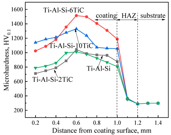 The microhardness distribution from the cladding surface to the substrate is shown in Figure 8. It is shown that the microhardness distribution trends of all cladding layers are similar. The microhardness distribution of the coatings with different contents of TiC can be divided into three-stage which is consistent with the microstructure. The hardness of the dilution zone is significantly lower than that of the cladding zone, which is caused by the dilution effect of the substrate on the coating. The area within 1.0 mm from the surface has a higher microhardness and is a laser cladding coating layer. The microhardness of the cladding layers of each sample is significantly higher than that of the substrate. The 1.0–1.2 mm area from the surface is the heat affected zone (HAZ), and its microhardness drops rapidly. The third zone is substrate from 1.2 mm inside with an average microhardness of 285 HV0.1.