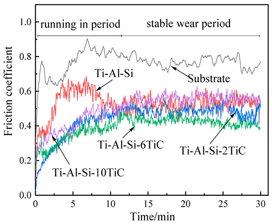 Typical evolution of friction coefficients of Ti-Al-Si-xTiC composites with sliding time.