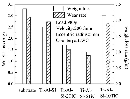 Figure 10 shows the data of the wear loss for the composite coatings and substrates. The results reveal that the wear mass loss and wear rate of the Ti-6Al-4V substrate are the highest, namely, 3.3 mg and 2.1 g/m, respectively. The wear mass loss of the Ti-Al-Si coating without TiC is 2.5 mg, while the wear mass of the coating with 6% TiC is the smallest at 1.4 mg, which is mainly attributed to their higher microhardness than that of the Ti-6Al-4V alloy. The wear loss of the coating with TiC is less than the wear amount of the Ti-Al-Si coating without TiC. Similarly to the microhardness results, the wear resistance of the Ti-Al-Si-10TiC coating is slightly lower compared to Ti-Al-Si-6TiC when reduced. Too much TiC will reduce the wear resistance of the coating, which is mainly due to the high TiC content that reduces the plasticizing effect of the coating. The tendency will produce a higher cracking phenomenon, and under the action of the GCr15 steel ball in the cladding, cracks will continue to form and expand; moreover, because of the falling of wear debris, the overall wear loss will increase significantly. The similar phenomenon is also reported in Ti-Fe-TiC composite [16]. Therefore, the hardness and wear resistance of the cladding coatings can be greatly improved when the concentration of TiC is higher and the grain size is smaller.