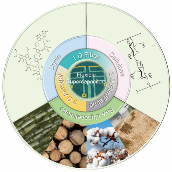Lignocellulosic biomass-derived carbon can be potentially used in flexible supercapacitors due to their low cost, natural abundance and sustainability. The structures of lignocellulose stocks are typically composed of carbon (C), hydrogen (H) and heteroatoms of oxygen (O) [17], nitrogen (N), sulfur (S) and phosphorus (P), etc. In general, these heteroatoms can result in self-doped biomass-derived carbon after pyrolysis [18,19]. They often boost the electrical conductivity, improve the surface wettability, introduce pseudocapacitance, accelerate the charge transfer, and facilitate the electrode/electrolyte interface reactions in lignocellulose-derived carbon, thereby enhancing the EC performance of lignocellulosic biomass-derived carbon electrode-based supercapacitors [20,21,22]. The hierarchically intermeshed lignocellulose structures are held by covalent or non-covalent bonding. After carbonization/activation, lignocellulosic carbons with hierarchical pores (micro-, meso- and macropores) offer high SSA to accommodate ions, abundant channels for ions transportation and sufficient reservoir spaces for ion-buffering. Therefore, lignocellulosic carbons with interconnected hierarchical porous frameworks and high SSA can efficiently improve the EC performances of supercapacitors [23]. Thus, it is of great importance to review the current development of lignocellulose-derived carbon electrodes in flexible supercapacitors.