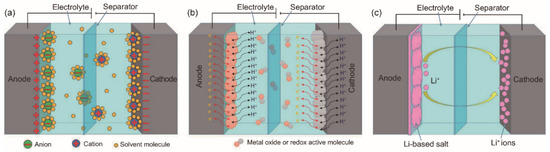 Energy storage principles of (a) electrical double-layer capacitors (EDLCs), (b) pseudocapacitors, and (c) asymmetric supercapacitors. Reprinted from ref. [32], an open-access article.