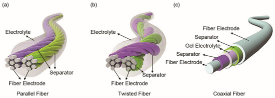 Structurally, FSSCs can be assembled from fiber electrodes in parallel, twisted or coaxial form [44]. The parallel structure is obtained by placing two fiber electrodes in parallel and encapsulating them with a solid electrolyte (Figure 3a). The assembled FSSCs can be used together in series or in parallel to meet specific energy and power requirements of microelectronics. The FSSCs with twisted structure are fabricated by winding fiber electrodes together (Figure 3b). This process is quite similar to the twisting of yarns in textile manufacturing process. This twisted structure, with a high direct contact area between the fiber electrodes, is beneficial for the electrochemical reaction during the charge/discharge process. A coaxial structure (Figure 3c), comprising of a core fiber electrode, a separator or solid-state electrolyte, and an outer electrode layer, is achieved by the layer-by-layer method. Compared with the aforementioned two structures, this coaxial structure has a much larger effective electrode contact area, which is more conducive to the adsorption/desorption of charges on the electrode surface and the redox reaction. Moreover, the assembled device is more stable under deformation since it has good integrity as a whole.