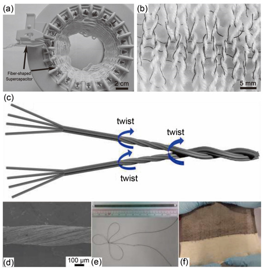 In this context, numerous efforts have been made in developing flexible and efficient energy storage systems (i.e., supercapacitors (SCs), batteries and fuel cells, etc.) for smart textiles. A good example is the supercapacitor, which is the main component of electrochemical (EC) energy storage devices. A supercapacitor, also known as ultracapacitor or electrochemical capacitor, has the characteristics of high power density, fast charge/discharge cycles, and good cycle performance (>100,000 cycles) [2,3,4,5]. Considerable research and development has focused on transforming a rigid capacitor into a flexible capacitor in recent years since the latter is lightweight, small and portable [6,7,8], and suitable for application in smart textiles. Two-dimensional (2D) planar structured flexible supercapacitors have been developed to be employed in 2D woven fabrics [9,10]. Three-dimensional (3D) carbon aerogels have also been applied in flexible SCs. To further integrate flexible SCs into fabric structure, it is of great importance to develop one-dimensional (1D) fiber-shaped supercapacitors (FSSCs) with good mechanical strength for textile manufacturing (i.e., weaving, knitting, braiding, etc.), and excellent EC performance for energy storage. Although studies regrading FSSCs for flexible electronic applications are proliferating, the development of wearable fiber-shaped or yarn-shaped SCs is still at an initial stage [11,12,13,14,15].