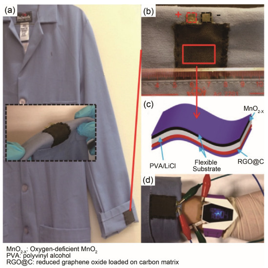 (a–d) The assembled wearable supercapacitor provides high energy/power capacity as worn in the real cloth. Reproduced with permission from ref. [56] Copyright 2014 Elsevier.