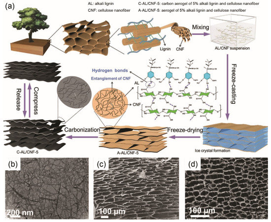 (a) Illustration of fabricating wood-derived C-AL/CNF-5; (b) Transmission electron microscope (TEM) image of CNF; Scanning Electronic Microscope (SEM) images of (c) A-AL/CNF-5 and (d) C-AL/CNF-5. C, A, AL, CNF represent carbon aerogel, aerogel, alkali lignin, cellulose nanofiber, respectively, and 5 indicates that the concentration of AL and CNF is 5%. (a–d) Reproduced with permission from ref. [62] Copyright 2020 John Wiley and Sons.