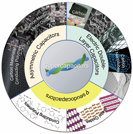 The diagram illustrating typical electrode materials for different types of supercapacitor. Carbon aerogels, activated carbons, carbon fibers, carbon nanotubes and graphene are mainly for EDLCs; metal oxide and conducting polymers are used for pseudocapacitors; carbon materials/conducting polymers or carbon materials/metal oxides are for asymmetric capacitors.