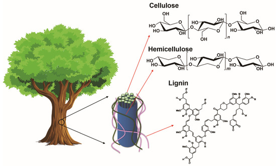 Lignocellulosic biomass consists of three main biopolymers, which are carbohydrates (cellulose and hemicellulose) and lignin (Figure 8). In the cell wall, the primary component is cellulose, which forms highly oriented and long fibrils. The amorphous, highly branched hemicellulose are attached to the adjacent cellulose fibrils by non-covalent crosslinks. Lignin is an amorphous, three-dimensional molecule linked to carbohydrates by hydrogen and covalent bonds. Typically, cellulose, lignin or raw lignocellulosic biomass are converted into carbon electrodes for flexible supercapacitors by carbonization, activation and possible surface modification. The SSA, porosity and surface chemistry can be tuned to yield flexible supercapacitors with good EC performance. These fabrication processes will briefly be introduced in this section.