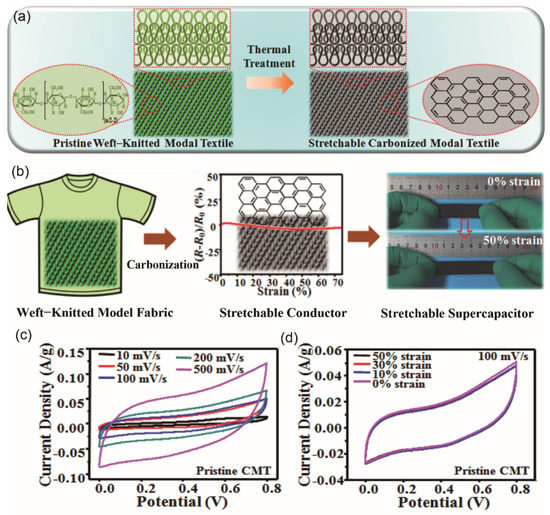 Moreover, a fabric-based electrode can be obtained from flexible bio-based fabrics through a simple carbonization process, which is a cost-effective and sustainable route. Wang et al. [58] carbonized weft-knitted Modal fabric, and assembled inherently stretchable and conductive fabric-based supercapacitors with PVA/H3PO4 gel as an electrolyte/separator. This fabric-based supercapacitor exhibited a maximum specific capacitance of 7.5 mF/cm2 (1.2 F/g) at the scan rate of 10 mV/s, and a capacitance retention of 44% as the scan rate increased from 50 mV/s to 500 mV/s.