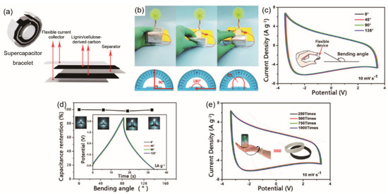 Cellulose fibers have been widely used in the manufacturing of textile fabrics. As mentioned in Section 3.2, inherently stretchable and conductive fabric-based supercapacitors were fabricated from cellulose based Modal raw material by weft-knitting technology, followed by carbonization [58]. The assembled stretchable supercapacitor demonstrated stable EDLC behavior and unique mechanical-electrical properties (Figure 9). The EC performance was quite mediocre and it could be optimized by employing higher carbonization temperature to decrease the internal resistance of carbonized fabric or by increasing the SSA in the carbonization process.