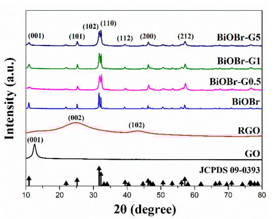 The GO, RGO, BiOBr, and the BiOBr-G nanocomposites synthesized using the microwave-assisted method were analyzed using XRD (Figure 2). The XRD pattern of the GO exhibited a distinct strong reflex at 2θ = 12.6°, corresponding to the (001) crystal plane of GO. In addition, notable peaks were observed in the XRD pattern of the RGO at 2θ = 25.0°and 43.1°, corresponding to the RGO (002) and (102) crystal plane, respectively [35]. However, the (001) crystal plane of GO was not observed in the XRD pattern of the RGO, confirming the successful reduction of GO by the microwave-assisted method. The XRD patterns of BiOBr and BiOBr-G nanocomposites were consistent with the standard card number of pure tetragonal phase BiOBr (JCPDS 09-0393) [36]. The main peaks of the XRD pattern were observed at 2θ = 10.9°, 25.3°, 31.7°, 32.3°, 39.3°, 46.3°, and 57.2°, corresponding to the (001), (101), (102), (110), (112), (200), and (212) crystal planes, respectively [37]. However, the (001) crystal plane of GO was not observed in the XRD patterns of all the BiOBr-G samples, confirming the successful reduction of GO. Furthermore, the typical diffraction peaks of RGO at 2θ = 25.0° and 43.1° were not observed in the XRD patterns of the BiOBr-G nanocomposites, which could be attributed to the relatively low diffraction peak intensity of RGO [38].