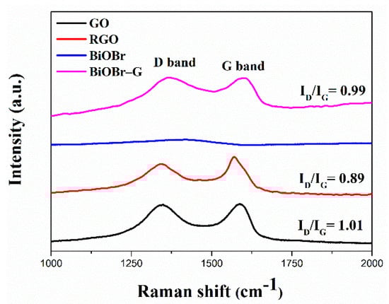 Figure 3 shows the Raman spectrum of GO, RGO, and BiOBr-G. Two notable bands, the D and G bands, were observed in the Raman spectra of GO and RGO, respectively. The D band corresponded to the k-point phonon mode, which could be attributed to the sp3 defects in the carbon material, such as vacancies and edge effect. The G band could be attributed to the sp2 carbon atoms vibration model [39,40]. The D and G bands of GO were observed at 1348 cm−1 and 1587 cm−1, respectively. In addition, the D and G bands of RGO were observed at 1343 cm−1 and 1572 cm−1, respectively. However, no notable peak was observed in the Raman spectrum of BiOBr. In addition, two bands were observed in the Raman spectrum of BiOBr-G at 1365 and 1601 cm−1. The D band to G band intensity ratio of BiOBr-G (ID/IG = 0.99) was slightly lower than that of the pure GO (ID/IG = 1.01). This confirms the decrease in the sp3 domain of the carbon atoms in BiOBr-G and the increase in the production of the graphene sp2 structure in BiOBr-G. According to the literature, these results correspond to the high electron transport rate of BiOBr-G [41,42]. In addition, the ID/IG value of BiOBr-G was higher than that of RGO (ID/IG = 0.89), indicating that the RGO loaded with BiOBr has more defects than RGO. The shift of the D and G band in the BiOBr-G Raman spectrum confirmed that the microwave-assisted synthesis achieved both the reduction of GO and the formation of Bi-OBr-G [24,43].