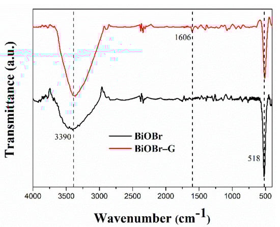 The FT-IR spectra of BiOBr and BiOBr-G nanocomposites are shown in Figure 4. A notable band was observed in the FT-IR spectra of the BiOBr nanosheets at 514 cm−1, which could be attributed to the typical symmetric A2u type of the Bi–O bond vibrations. In addition, a similar band was observed in the FT-IR spectra of the BiOBr-G nanocomposite [44,45]. Furthermore, a wider absorption band was observed in the FT-IR spectra of these samples at 3404 cm−1, which could be attributed to the O–H stretching mode of adsorbed water or hydroxyl groups [46,47]. Moreover, the BiOBr-G sample exhibited the typical FT-IR spectrum of BiOBr-G. This indicates that the addition of GO to BiOBr during the microwave-assisted synthesis had no effect on the crystal structure of BiOBr [48].