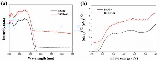 Figure 6a shows the UV-Vis diffuse reflectance spectra (DRS) results of BiOBr and BiOBr-G nanocomposites. As shown in the image, both BiOBr and BiOBr-G exhibit a wide and high absorption in the visible light range. In addition, the absorption peak of BiOBr was observed at 445 nm. After adding RGO, the BiOBr-G absorption edge slightly red-shifted to 462 nm. The optical band gap (Eg) of the BiOBr and BiOBr-G composites was obtained using the Tauc relation, as follows [54]: