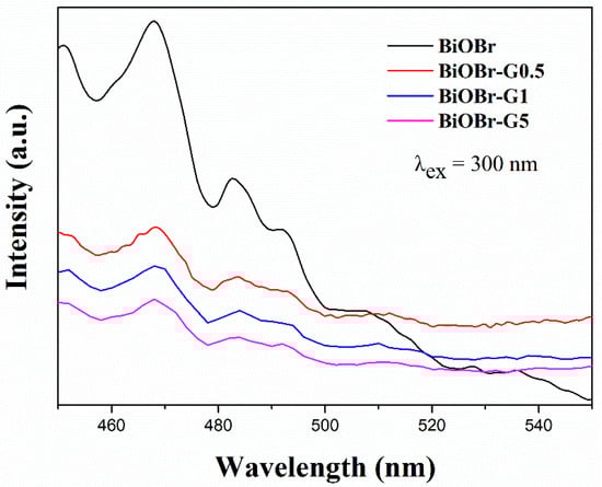 The PL spectra of BiOBr and BiOBr-G were obtained to investigate their electron–hole recombination properties. With an increase in the PL intensity of a sample, its photon separation rate decreases, thus increasing the electron–hole pair recombination. Consequently, this reduces the photocatalytic activity of the sample [57]. Figure 7 shows the PL spectrum of the as-synthesized BiOBr and BiOBr-G nanocomposites at an exciting wavelength (λex) of 300 nm. The highest peaks of BiOBr and BiOBr-G were observed at 468 nm. However, the PL spectral intensity of the pure BiOBr was significantly stronger than that of BiOBr-G. With an increasing in the RGO content, the intensity of the BiOBr-G emission peak decreased, indicating that the addition of RGO enhanced the separation of carriers. These results confirmed that photoelectrons moved from BiOBr to RGO and that RGO facilitated the suppression of the electron–hole pair recombination [58]. This indicates that a higher quantum efficiency can be achieved during photocatalytic reactions by utilizing the hierarchical structure of BiOBr-G.