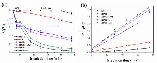 To investigate the photocatalytic properties of the fabricated samples, the MB degradation properties of commercial TiO2 (P25), BiOBr, and each BiOBr-G sample under visible light were investigated (Figure 8a). The results revealed that the pure MB did not exhibit self-degrading properties under visible light; however, the addition of the photocatalyst significantly improved the removal efficiency [59]. The order of MB removal percentage of each material was: TiO2 P25 (29.74%) < BiOBr (67.25%) < BiOBr-G0.5 (71.37%) < BiOBr-G1 (90.80%) < BiOBr-G5 (96.41%). The photocatalytic activity of P25 under visible light was lower than those of the other samples, which could be attributed to the fact that the band gap of P25 is higher than that of BiOBr and BiOBr-Gs. This indicates that the P25 sample exhibited the lowest MB removal rate compared to the other samples. In addition, the photocatalytic activity of all the BiOBr-G nanocomposites was significantly higher than that of BiOBr. These findings are consistent with the PL spectra in Figure 7. Furthermore, the photoelectron–hole pair separation efficiency of the BiOBr-G sample was higher than that of the BiOBr sample, and it also exhibited an optimum photocatalytic activity performance. The addition of RGO to BiOBr significantly enhanced the photocatalytic activity of BiOBr, with the optimum RGO concentration being 5 wt%. In addition, the photo-induced electron transfer rate from the BiOBr surface to the RGO surface increased with an increase in the RGO loading, thus increasing the photocatalytic activity of the BiOBr-G nanocomposite. The prepared photocatalyst follows the first-order kinetic model (Figure 8b), which can be expressed using the following equation [60]: