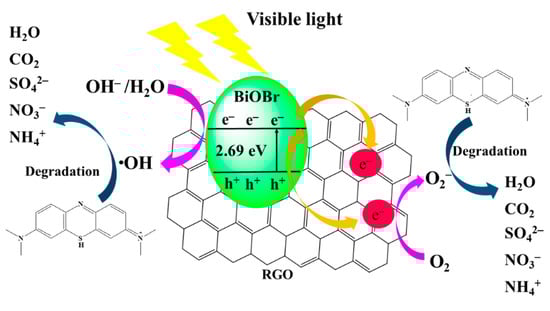 The RGO exhibits an extremely efficient electron collection and separation structure. After the charge separation of BiOBr, the excited electrons were transferred to the RGO surface, thus decreasing the rate of electron–hole recombination [70]. Photogenerated electrons reacted with O2 molecules adsorbed on the surface of the RGO to produce O2− radicals. Simultaneously, the OH− and H2O reacted with the holes in the VB, thus generating •OH radicals. The RGO nanosheets enhanced the electron–hole pair separation and also increased the adsorption of reactants owing to π–π interactions and electrostatic force effects. In addition, the high surface area of RGO facilitated the adsorption of MB and the active oxides (O2− and •OH radicals), thus enhancing the contact probability with radical and dye molecules and enhancing the photocatalytic activity of the catalyst. Finally, the MB molecules were degraded by O2− and •OH radicals, thus producing non-toxic small molecules (H2O, CO2, SO42−, NO3−, and NH4+). This photocatalytic process can be represented using the following chemical equation [20,71].