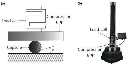 Each type of capsule was squeezed at room temperature between two parallel rigid plates moving toward each other at a constant velocity of 10 mm/min (Figure 1) using a universal testing machine (Unitest M1, TEST ONE, Busan, Korea). At the start of the experiment, the initial distance between plates was set to the initial capsule size of 2r, measured with a charge-coupled device (CCD) camera (TEST ONE, Busan, Korea) to confirm the 3D-printer-specified size.