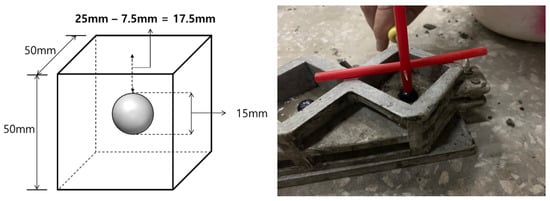 To examine the effect of the capsule orientation on the compressive strength of the cement composite, we inserted the capsules into the cement mortar in vertical (i.e., vertical mortar specimen, denoted by VMS; printing angle 0°) and horizontal (horizontal mortar specimen, HMS; printing angle 90°) orientations. It is expected that the capsule orientation may affect the compressive strength of the mortar owing to the printing angle. In addition, for comparison, we also prepared a plain specimen without the capsule. The cement composite specimens were mixed with water using a mechanical mixer with a water-to-cement ratio of 0.4 and filled into and 50 mm3 molds. Each capsule was placed at the center of the cement composite specimen (Figure 2). After 24 h, the test specimens were demolded and cured for 7 days in a constant-temperature-and-humidity curing chamber at 40 °C and a humidity of 100%. The compressive strength and unit weight of each specimen were determined according to the KS L 5105 and KS F 2462 testing standards, respectively. The strength was taken as the average value of three identical test specimens.