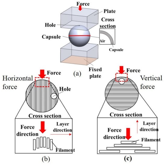 In the FDM 3D-printing method, filaments are stacked to produce the structure of interest, in which the deformation and destruction depend on the relationship between the direction of the applied force and the layer stacking direction; thus, both shear and normal stresses on the capsule must be analyzed. Figure 3a shows the modeling of the simulation environment, whereas Figure 3b,c depict the methods applying the horizontal and vertical forces, respectively, to the capsule. The simulations were performed with forces of 100, 400, and 700 N applied to the capsule along the horizontal and vertical directions (relative to the layer direction) to compare the stress in capsules with wall thicknesses of 0.25, 0.4, and 0.8 mm.