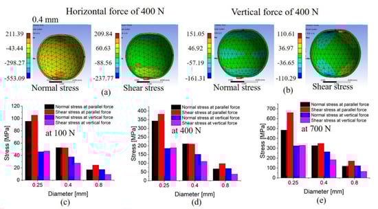 (a) Deformation and stress simulation of the capsule when a force of 400N is applied to the 0.4 mm capsule in the horizontal direction of the layer and (b) deformation and stress of the capsule when a force of 400N is applied to the 0.4 mm capsule in the vertical direction of the layer. Normal and shear stress at the thickness of 0.25, 0.4, and 0.8 mm by the applied force: (c) 100 N, (d), 400 N, and (e) 700 N.