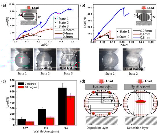 Compression test with variable capsule thicknesses for printing angles of (a) 0° and (b) 90°, respectively. (c) Bursting load and (d) schematic figures of bursting points with variable capsules having different printing angles.