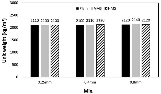 Capsules were inserted into cubic cement specimens, and the compressive strength and unit weight of the specimens were measured. In addition, each capsule was coated with resin to prevent oil leakage. Figure 6 shows the unit weights of the specimens, which range from 2100 kg/m3 to 2140 kg/m3, regardless of the capsule wall thickness. Figure 7 shows the changes in the compressive strength according to the capsule wall thickness. The specimens without capsules exhibited the highest compressive strength at ~42.8 MPa, whereas those with capsules showed slightly lower strengths. This reduction can be attributed to the air bubbles trapped under the capsule during capsule insertion and the adhesive strength between the capsule and the cement matrix.