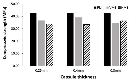 - Plain cement composite specimens without embedded capsules demonstrated the highest compressive strength of ~42.8 MPa, whereas the capsule-embedded specimens were somewhat weaker. In addition, with capsule wall thicknesses of 0.25 mm and 0.4 mm, the VMS specimen embedded with a vertically oriented capsule was slightly stronger than the HMS specimen with a capsule inserted horizontally.